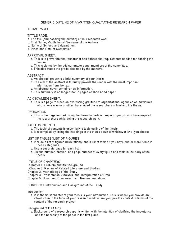 Qualitative Research Paper Outline : Pdf Sampling In Qualitative Research Rationale Issues And Methods - Three of these designs will be discussed in this paper.. For a qualitative research thesis prospectus include the following: Definition and purpose of abstracts an abstract is a short summary of your (published or unpublished) research paper, usually about a paragraph (c. The research paper outline according to mla format includes the following elements. Title and abstract• draft a title that sums up what the paper is about, using key words if possible:'health, ethics and environment: You should provide your interpretations.